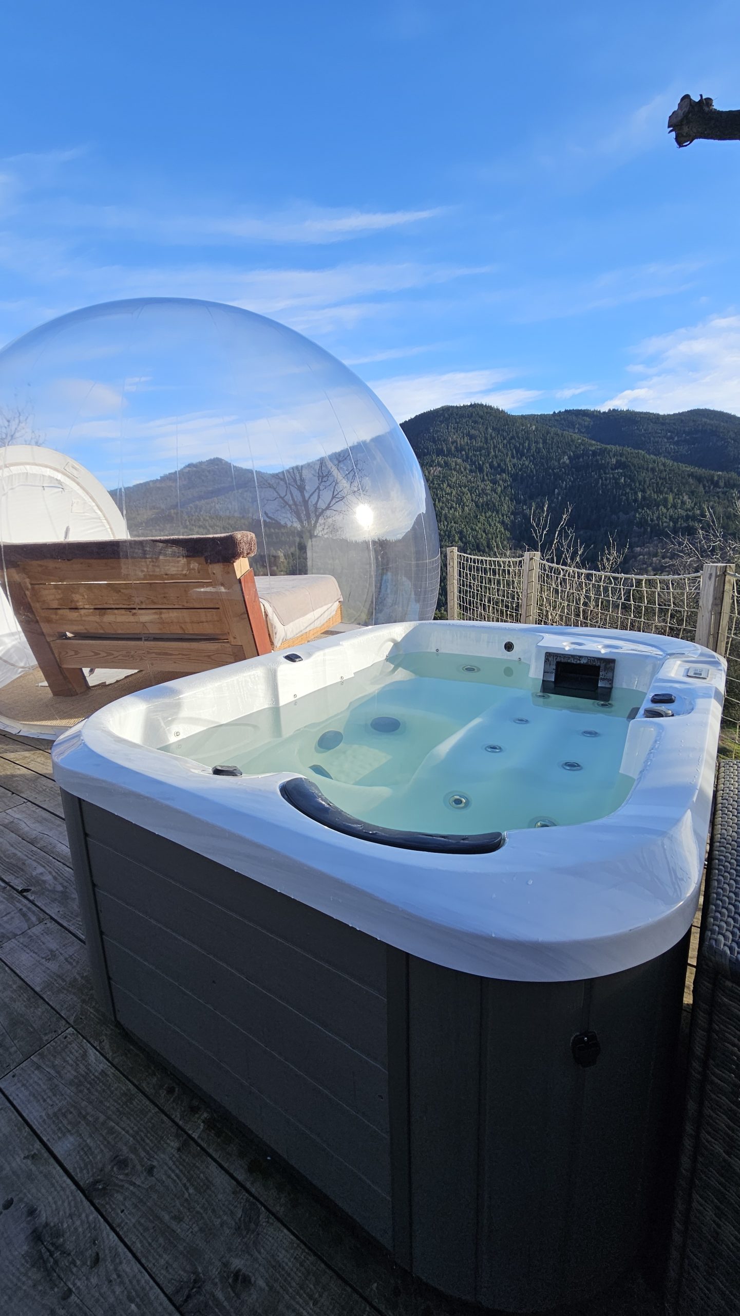 Plongez dans notre jacuzzi extérieur, niché au cœur des collines verdoyantes de l’Ardèche. L’eau bouillonnante vous enveloppe, tandis que le ciel azur et les nuages cotonneux vous offrent un spectacle apaisant.